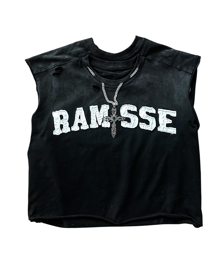 DETAILS: Double Collar, silver diamond cross chain, chenille lettering, ripped detailing for a worn-in aesthetic, feauturing a gradient wash.