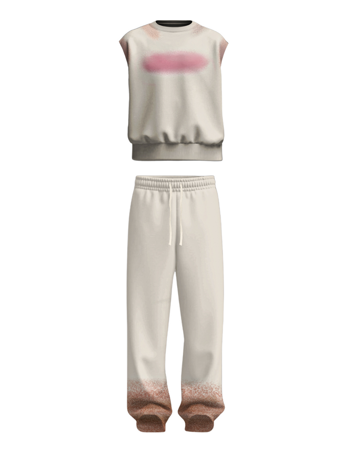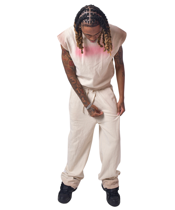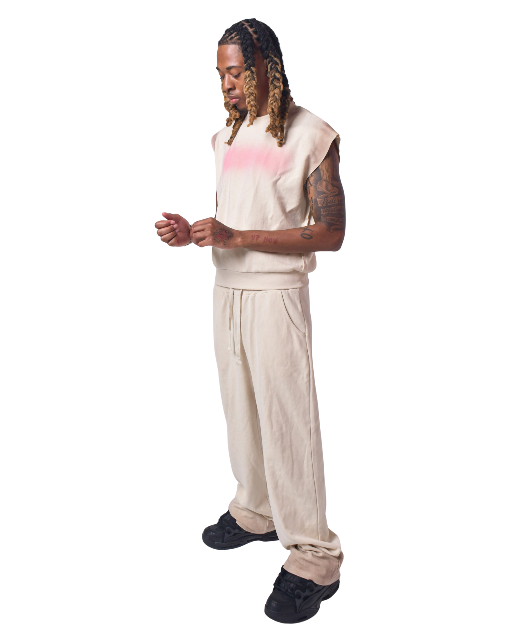 DETAILS: Sleeveless fleece set crafted in Spain, featuring raw edge shoulders and wide-leg bottoms for a clean, elevated silhouette.