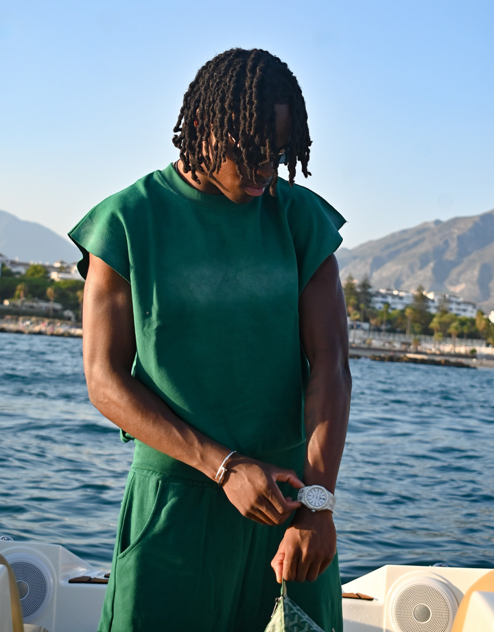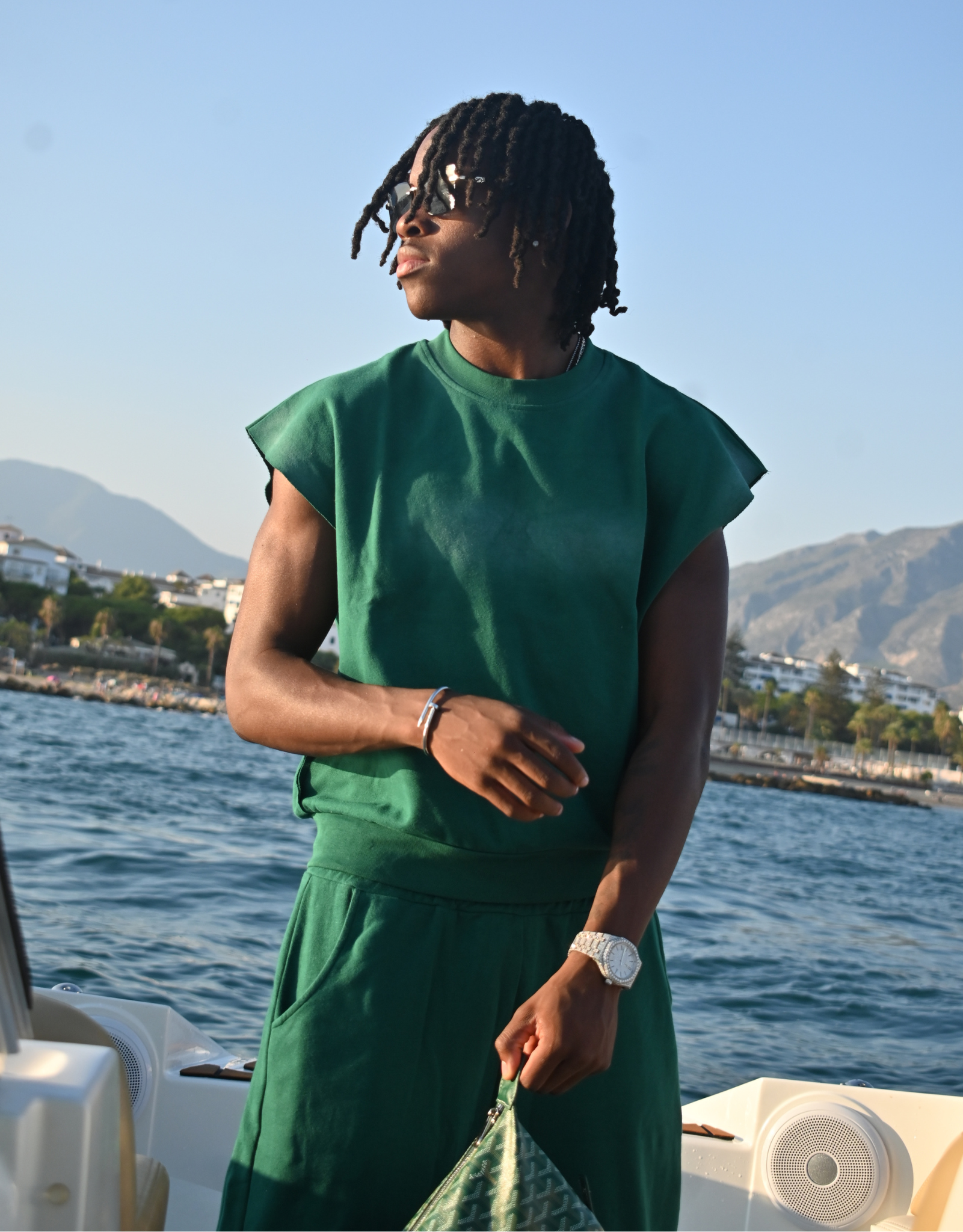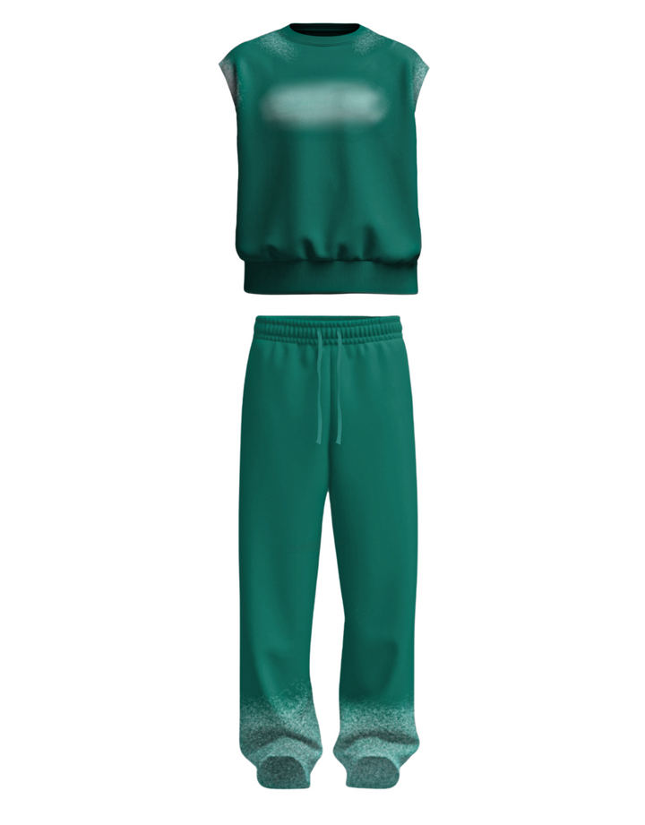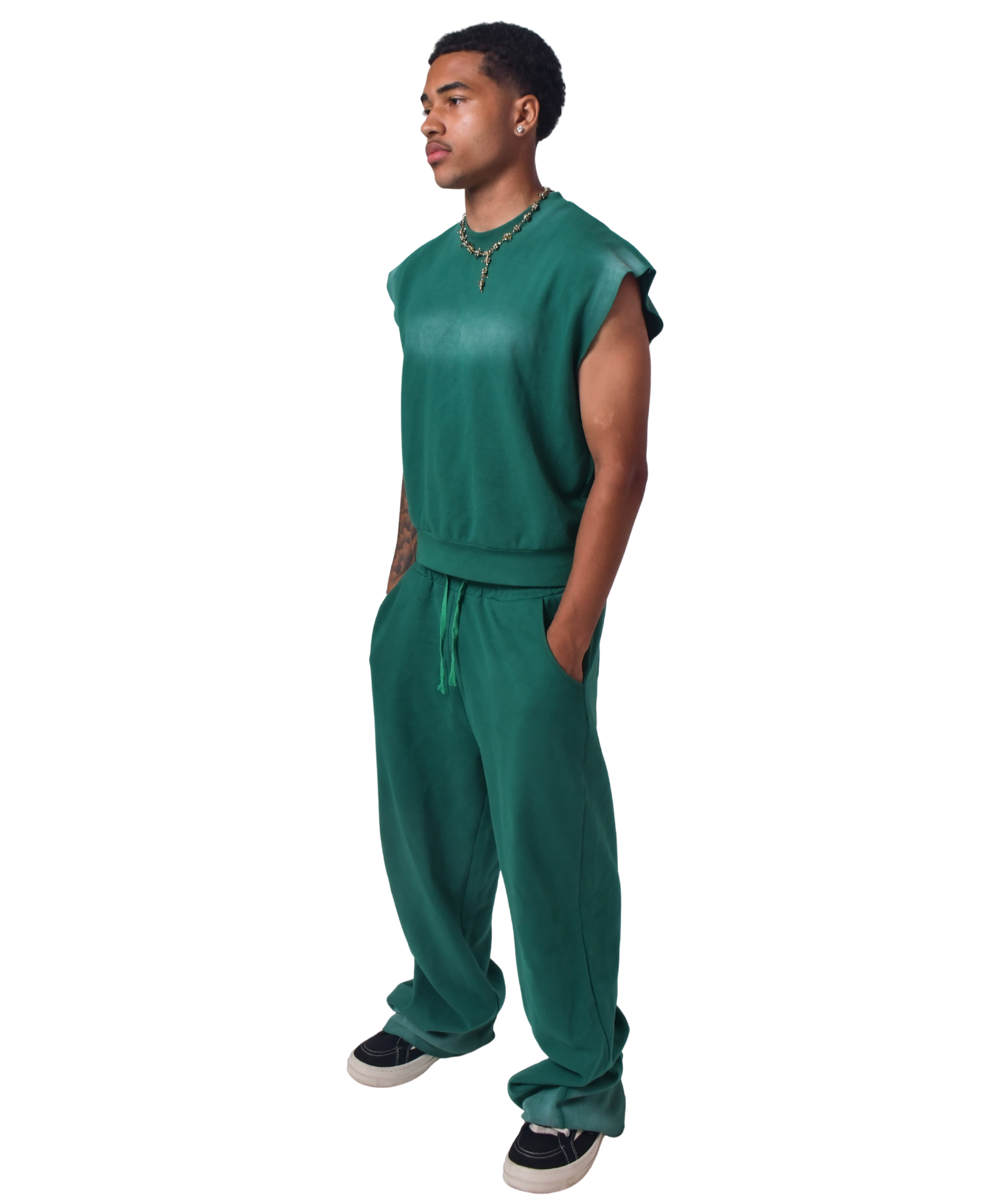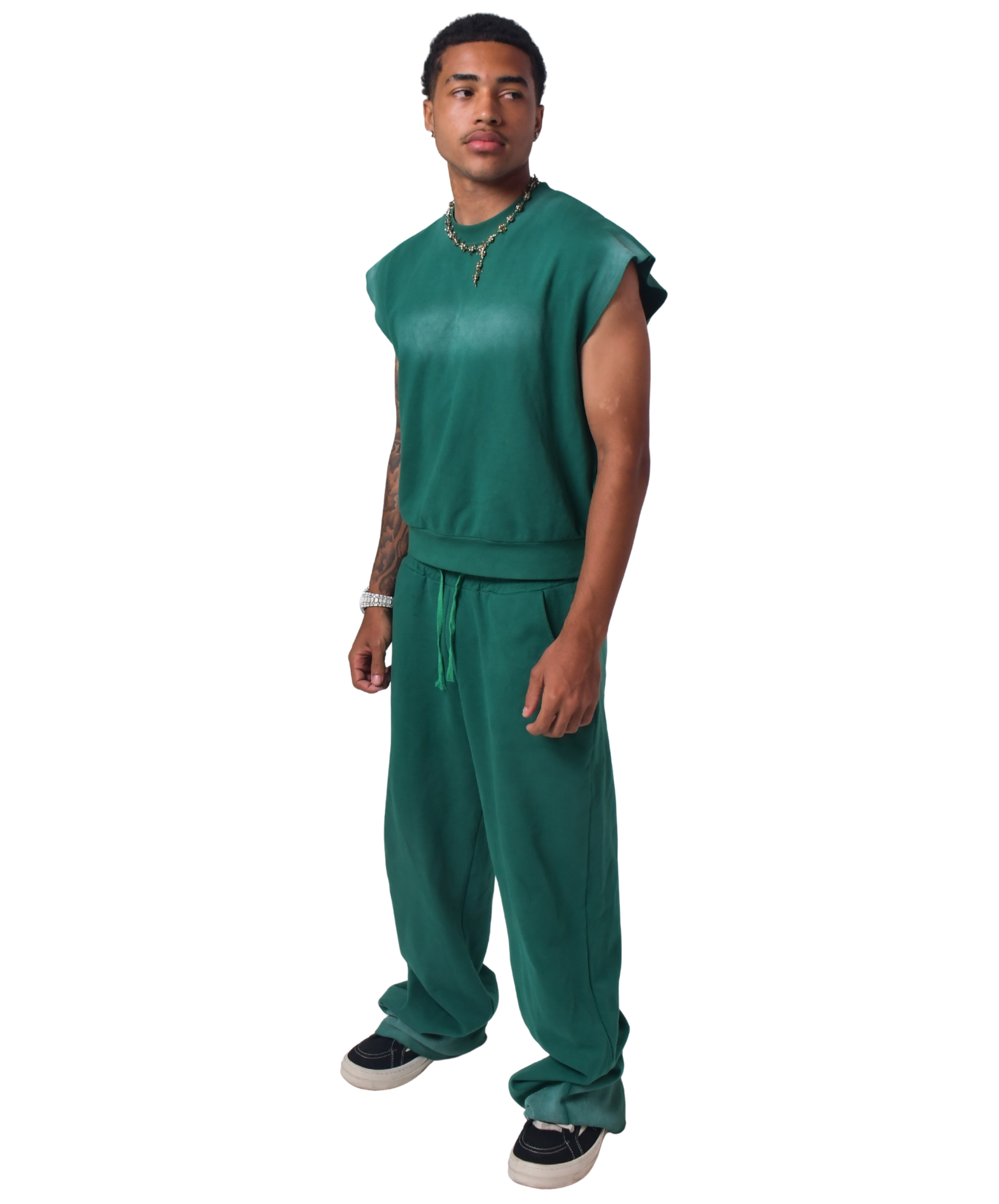 DETAILS: Sleeveless fleece set crafted in Spain, featuring raw edge shoulders and wide-leg bottoms for a clean, elevated silhouette.