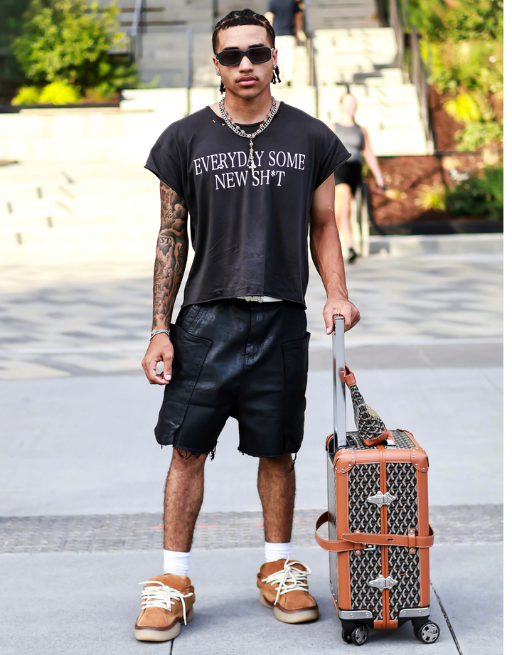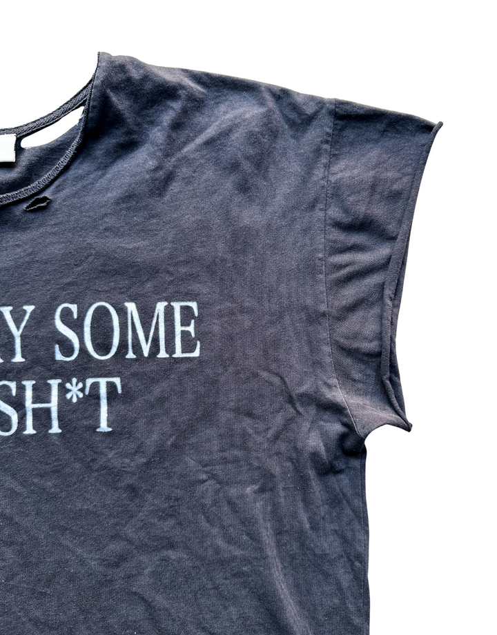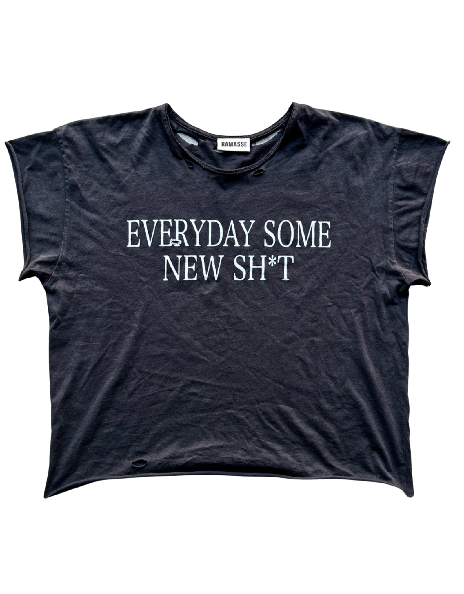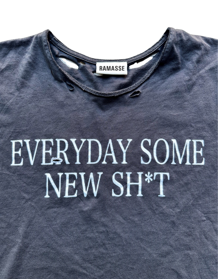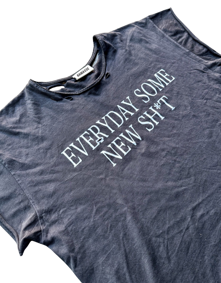 Relaxed ERD aesthetic, statement front graphic, subtle distressing with raw edge hems, finished in soft vintage-wash cotton.